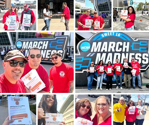 For the second week in a row, AT&T Orange Mobility members from CWA Locals 9421, 9423, 7901, 1122, and 4202 handed out informational flyers to attendees of AT&T-sponsored March Madness tournament games in Sacramento, Calif.; San Diego, Calif.; Portland, Ore.; Buffalo, N.Y.; and Chicago, Ill., respectively. The flyers call out AT&T for their corporate greed, spending millions of dollars to have their company logo featured all over March Madness promotional materials, yet refusing wage proposals at the bargaining table that reflect the real cost of living.